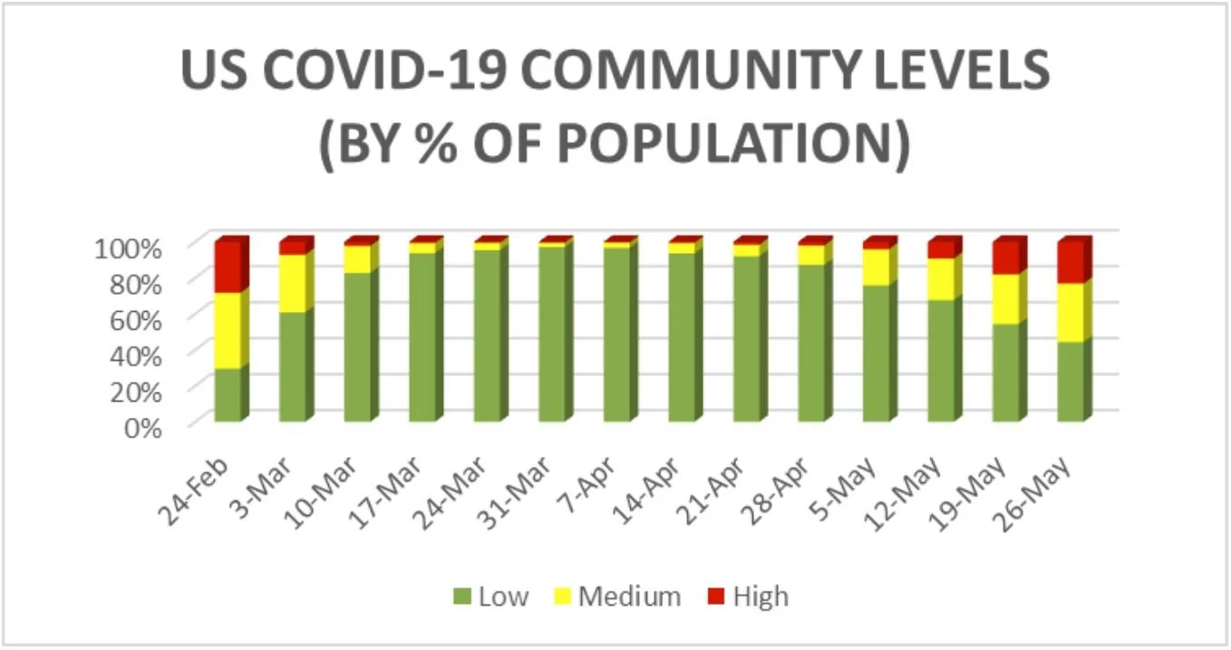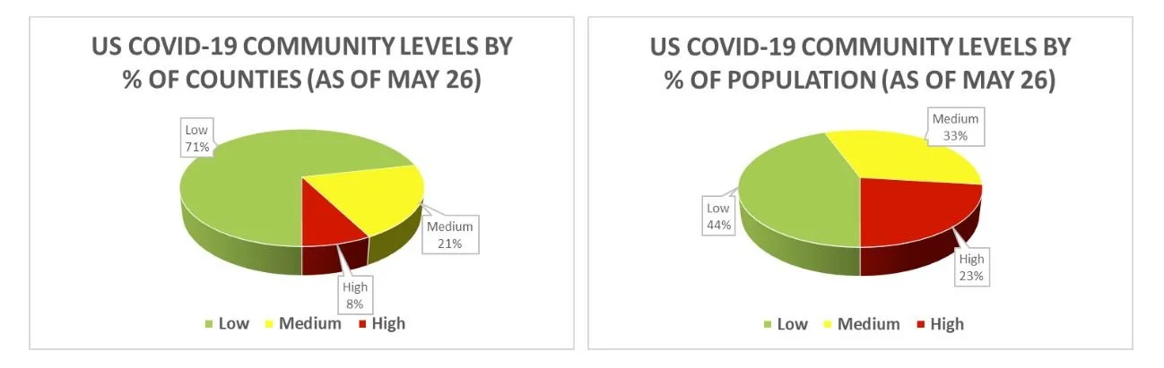 The CDC’s Community Levels by % of Counties and % of Population (as of May 26).